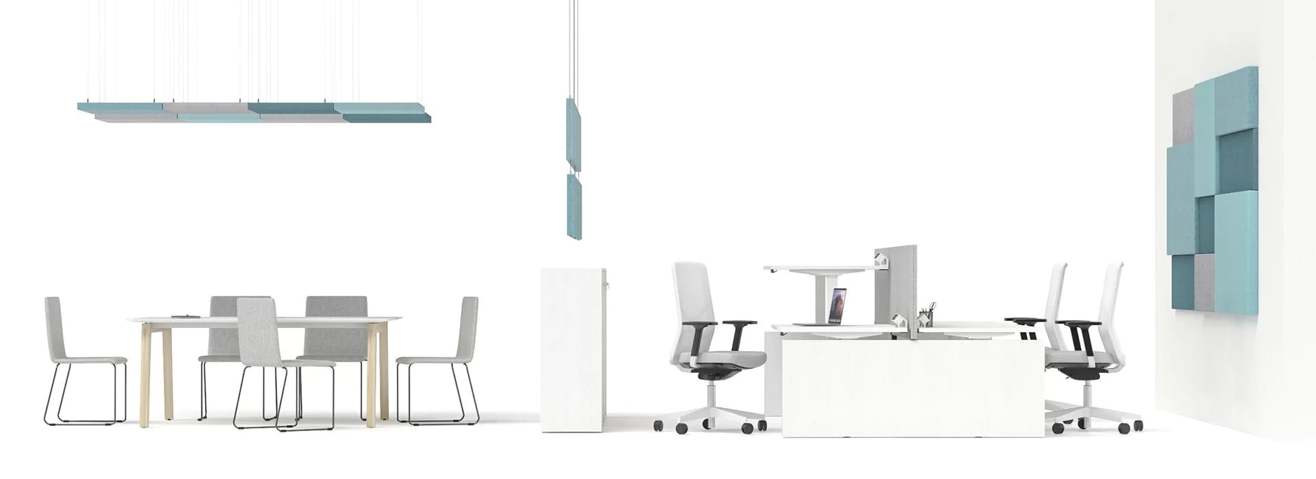 The MODUS acoustic panel system includes wall panels, horizontal ceiling panels, and vertical ceiling (double-sided) panels. Besides helping to create better acoustics in the office, they also serve as an excellent tool for creating spaces and subtle design solutions in the office.