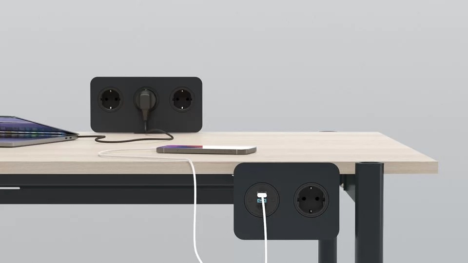 Exceptional power units blend in the whole design concept perfectly due to the choice of metal colour and rounded forms. The power unit can be mounted on or under the desk for convenient and quick access to electricity.
