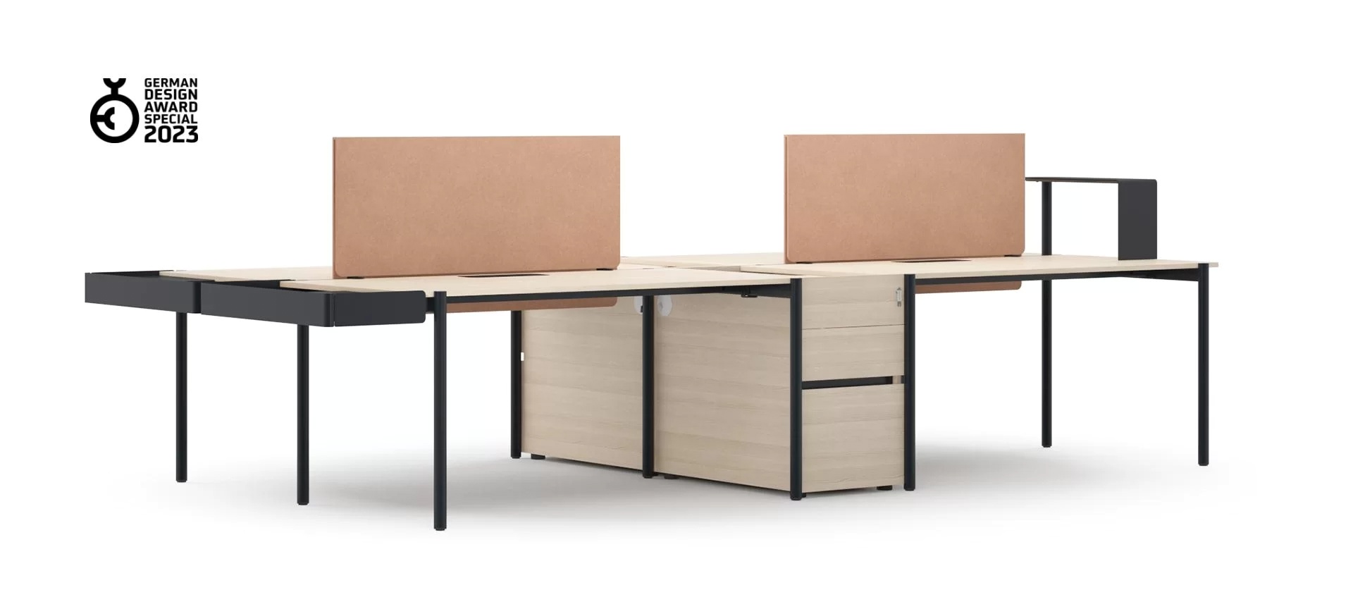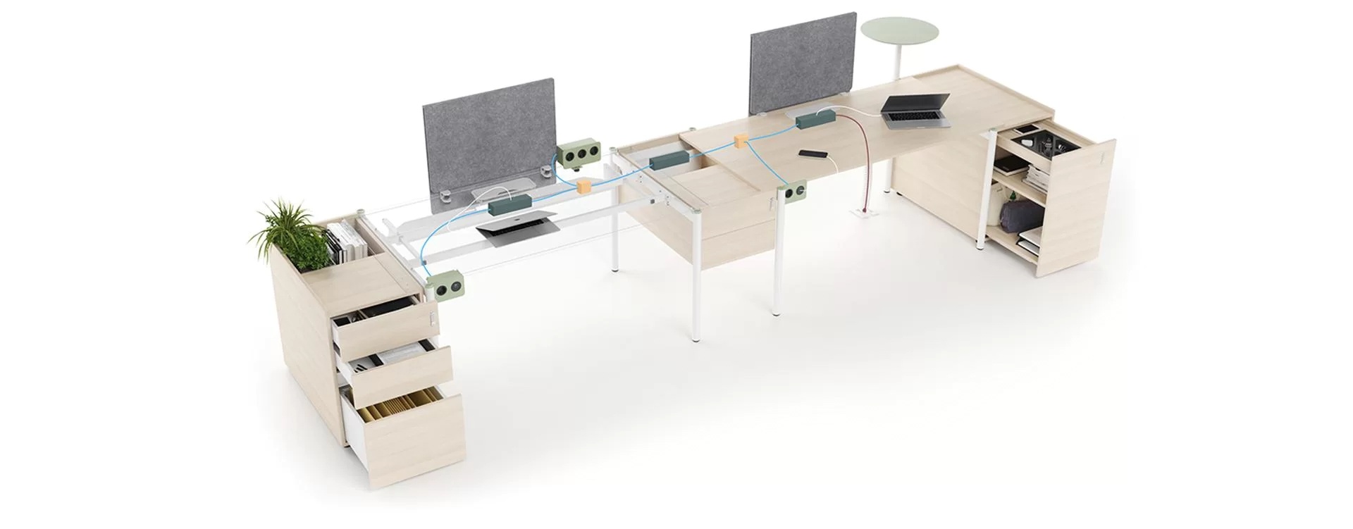 A wide range of pedestals and storage towers allow you to store your personal items conveniently as well as hide cables. The holes in the frames allow you to easily combine several workplaces into a single power circuit, while the elegant metal box with opening grommet provides easy access to the sockets.